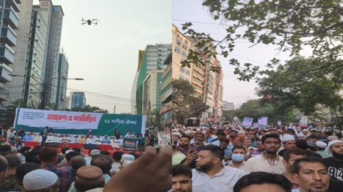 শাহবাগে মার্কিন বাণিজ্য চুক্তি বাতিলের দাবিতে সমাবেশ