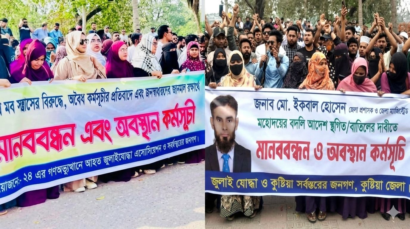 গত রোববার (১ মার্চ) সন্ধ্যায় প্রজ্ঞাপন জারির পরপরই শহরে বিক্ষোভ মিছিল বের হয়। ‘জুলাই যোদ্ধা ও কুষ্টিয়া সর্বস্তরের জনগণ’ ব্যানারে আয়োজিত কর্মসূচিতে জামায়াত-শিবির ও বৈষম্যবিরোধী ছাত্র আন্দোলনের সাবেক নেতাকর্মীরা অংশ নেন। তাঁদের দাবি, জেলা প্রশাসক দুর্নীতিবিরোধী অবস্থান নিয়ে প্রশাসনে শৃঙ্খলা ফিরিয়ে আনার চেষ্টা করছিলেন। তাই তাঁর প্রত্যাহারের সিদ্ধান্ত পুনর্বিবেচনার আহ্বান জানান তারা।