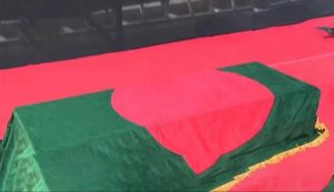 জাতীয় পতাকায় মোড়ানো কফিনে বিএনপি চেয়ারপার্সন ও সাবেক প্রধানমন্ত্রী বেগম খালেদা জিয়ার মরদেহ।