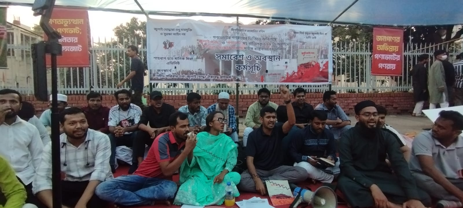 জানা গেছে, “জান দিব তবুও জুলাই দিব না” স্লোগানে শহীদ পরিবার এবং ‘জুলাই যোদ্ধা ঐক্যবদ্ধ প্লাটফর্ম’-এর উদ্যোগে এই সমাবেশ ও অবস্থান কর্মসূচির আয়োজন করা হয়। এতে বিভিন্ন পর্যায়ের জুলাই যোদ্ধা ও সংশ্লিষ্ট ব্যক্তিরা অংশগ্রহণ করেন।