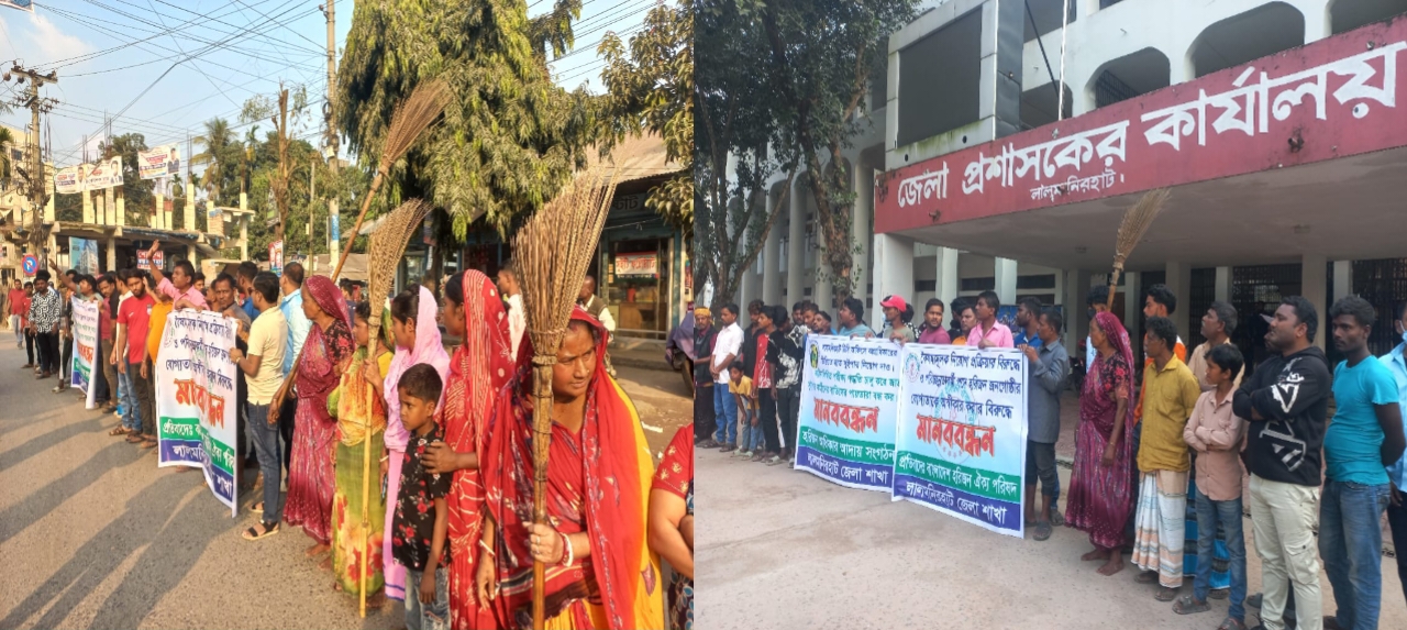 শনিবার (৬ ডিসেম্বর) বিকালে লালমনিরহাট বিভাগীয় রেলওয়ে স্টেশনের পূর্ব ও পশ্চিম পাশের দুইটি সুইপার কলোনীর শতাধিক মানুষ ব্যানার ও ঝাড়ু হাতে মিছিল নিয়ে ডিসি অফিসে বিক্ষোভ করে। পরে সেখানে ‘বাংলাদেশ হরিজন ঐক্য পরিষদ ও হরিজন অধিকার আদায় সংগঠন’ জেলা শাখার ব্যানারে একটি মিছিল মিশন মোড়ে এসে ঘন্টাব্যাপী মানববন্ধন করে।