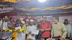 মাদরাসায় আয়োজিত সংবর্ধনা ও বার্ষিক পুরস্কার বিতরণী অনুষ্ঠানে প্রতিযোগিতায় বিজয়ী শিক্ষার্থীদের হাতে পুরস্কার তুলে দিচ্ছেন এ.এম. মাহবুব উদ্দিন খোকন।