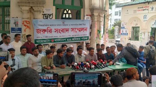 ডাকসু ভবনের সামনে ভুক্তভোগী শিক্ষার্থীর সংবাদ সম্মেলন