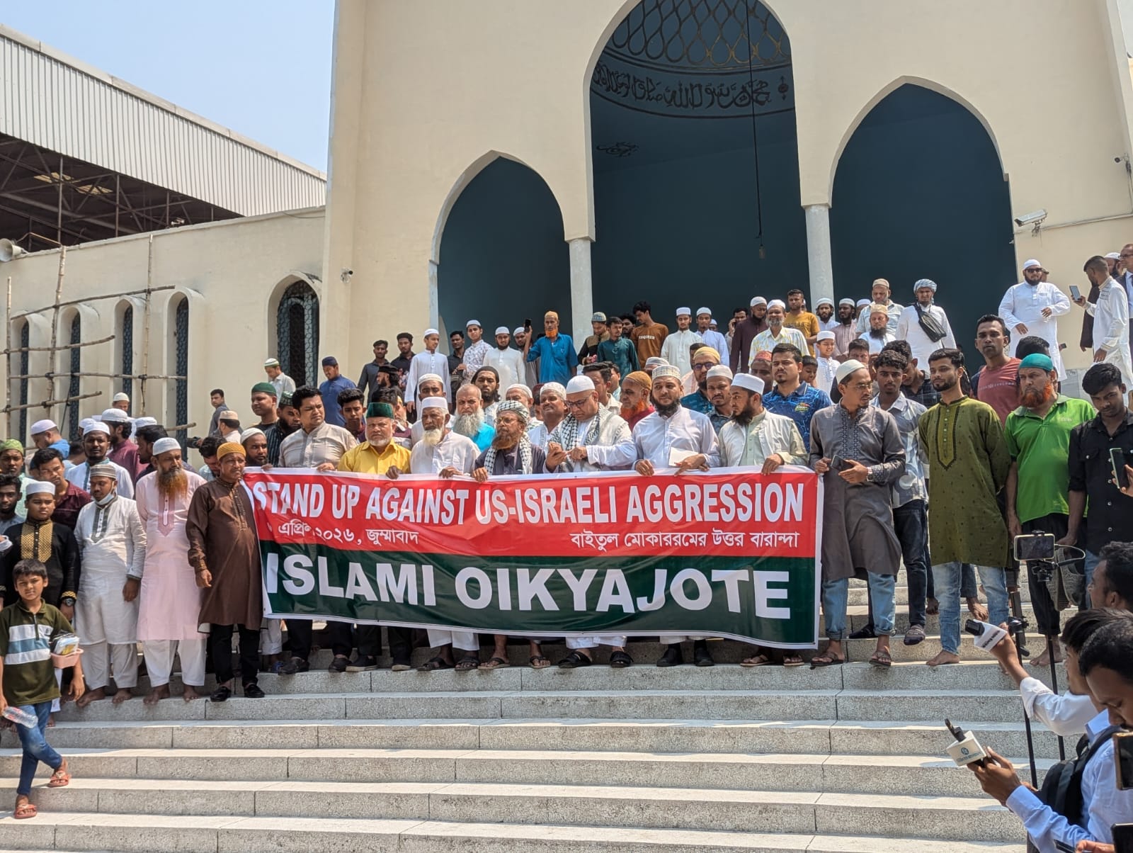 ইরানের ওপর যুক্তরাষ্ট্র ও ইসরায়েলের আগ্রাসনের প্রতিবাদে রাজধানীর জাতীয় মসজিদ বায়তুল মোকাররমের উত্তর গেইটে বিক্ষোভ সমাবেশ করেছে বাংলাদেশ ইসলামী ঐক্যজোট।