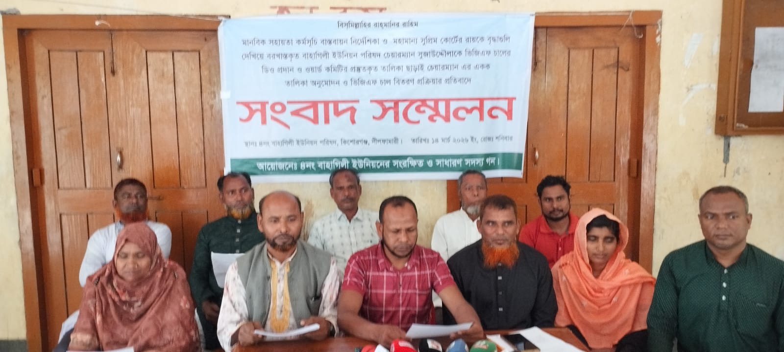 নীলফামারীর কিশোরগঞ্জে মানবিক সহায়তা কর্মসূচি বাস্তবায়ন নির্দেশিকা ও সুপ্রিম কোর্টের রায়কে বৃদ্ধাগুলি দেখিয়ে বরখাস্তকৃত বাহাগিলী ইউপি চেয়ারম্যান সুজাউদ্দৌলাকে ভিজিএফ চালের ডিও প্রদান ও ওয়ার্ড কমিটির প্রস্তুতকৃত তালিকা ছাড়াই চেয়ারম্যান এর একক তালিকা অনুমোদন ও ভিজিএফ চাল বিতরণ প্রক্রিয়ার প্রতিবাদে সংবাদ সম্মেলন করা হয়।