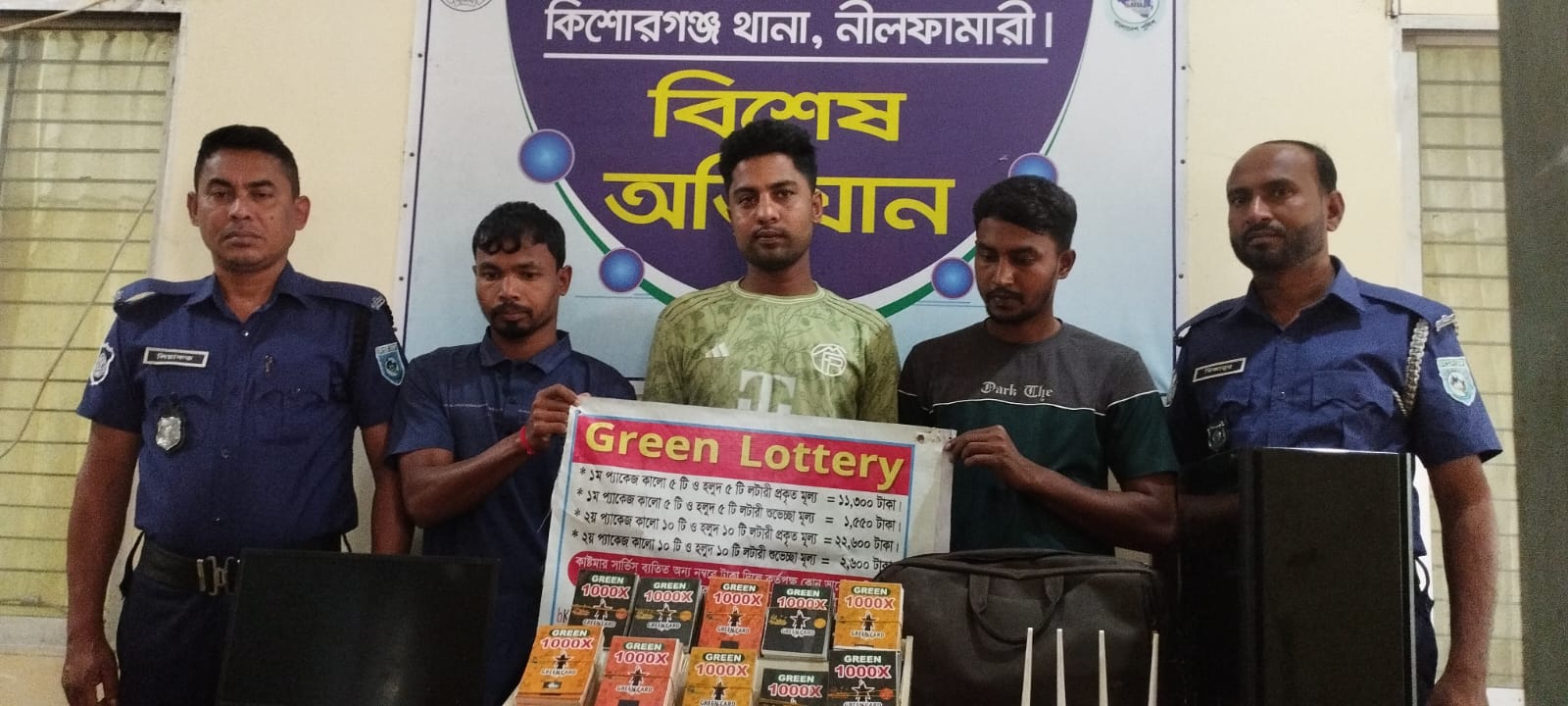 আটককৃতরা হলেন, কিশোরগঞ্জ উপজেলার বড়ভিটা ইউনিয়নের মেলাবর বৈস্য পাড়ার মৃত্যু ইব্রাহিমের ছেলে শরিফুল ইসলাম (২৪), মেলাবর পশ্চিম পাড়ার শ্রী নরেন চন্দ্র রায়ের ছেলে উকিল চন্দ্র রায় (২৪) ও জলঢাকা থানার দুন্দীবাড়ি ১ নং ওয়ার্ডের বাহাদুর ইসলামের ছেলে স্বাক্ষর ইসলাম (২৭)। এ সময় তাদের কাছ থেকে অ্যান্ড্রয়েড ফোন ৪টি, ওয়াইফাই রাউটার ১টি, ল্যাপটপ ১টি, ডেস্কটপ কম্পিউটার ১টি ও লটারির টিকিট ৮৬২টি সরঞ্জাম উদ্ধার করা হয়।