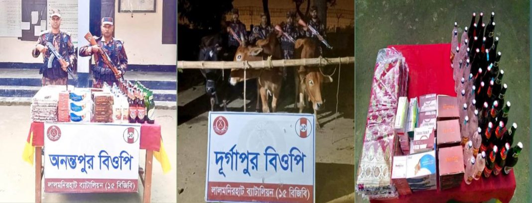 মঙ্গলবার (৩০ ডিসেম্বর) রাত আনুমানিক সাড়ে ১২টায় অনন্তপুর বিওপির আওতাধীন পশ্চিম রামখানা, নাগরাজ (থানা: নাগেশ্বরী, জেলা-কুড়িগ্রাম) নামক স্থানে বিজিবির টহলদল অভিযান পরিচালনা করে। অভিযান পরিচালনাকালীন কতিপয় সন্দেহজনক ব্যক্তিদের গতিবিধি লক্ষ্য করে টহল দলের সদস্যরা ধাওয়া করলে চোরাকারবারীরা তাদের সাথে থাকা মালামাল ফেলে দৌড়ে সীমান্ত অতিক্রম করে ভারতের অভ্যন্তরে চলে যায়। পরবর্তীতে ফেলে রাখা মালামাল তল্লাশী করে ভারতীয় KINGFISHER (মদ) ১৮ বোতল, Happy Gold মদ ২০ বোতল, Tuborg বিয়ার ০৯ বোতল, ভারতীয় শাড়ি ০৯ পিস এবং বিভিন্ন প্রকার ভারতীয় ঔষধ জব্দ করা হয়।