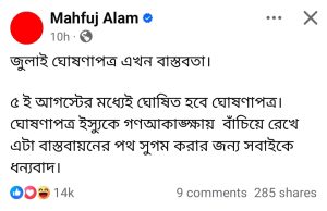শুক্রবার রাতে উপদেষ্টা মাহফুজ আলম নিজের ভেরিফায়েড ফেসবুক আইডিতে লেখেন, ‘জুলাই ঘোষণাপত্র এখন বাস্তবতা। ৫ আগস্টের মধ্যেই ঘোষিত হবে ঘোষণাপত্র। ঘোষণাপত্র ইস্যুকে গণআকাঙ্ক্ষায় বাঁচিয়ে রেখে এটা বাস্তবায়নের পথ সুগম করার জন্য সবাইকে ধন্যবাদ।’